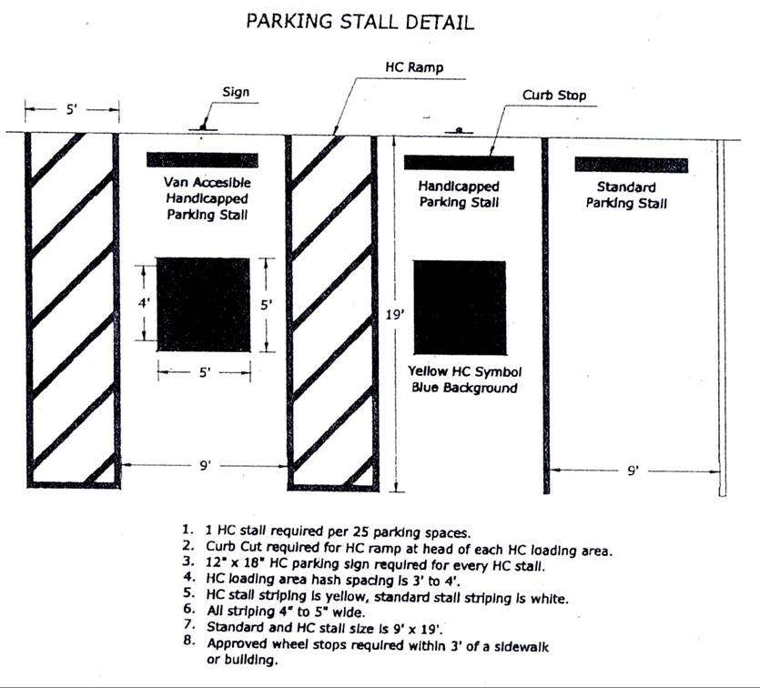 22-301. Area size. Each required parking space shall consist of a rectangular area of not less than nine (9) feet in width, by nineteen (19) feet in length. All required spaces shall be clearly marked and defined except for spaces for single-family and two-family dwellings, where parking spaces may be those portions of a driveway that are not within the city right-of-way.