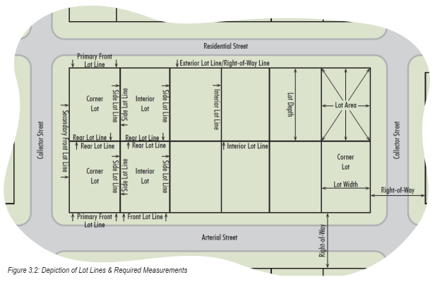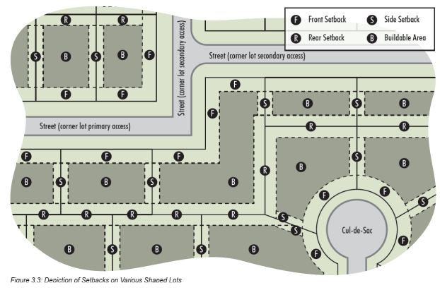 Lot Size Requirements: Restrictions on the dimensions of a lot. See Figure 3.2.