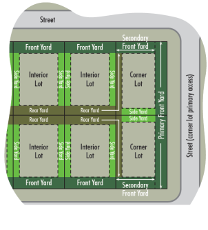 Front (corner lot): The lot line along the primary access street, typically the street to which the address is assigned.