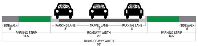 9.3.2. With parking on one side of the street: R-O-W width shall be 58 feet and roadway width shall be 29 feet.