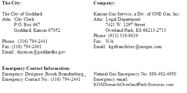 AN ORDINANCE, granting to Kansas Gas Service, a Division of ONE Gas, Inc., and its successors and assigns, a natural gas franchise, prescribing the terms thereof and relating thereto, providing definitions of terms, prescribing a franchise fee, providing terms and conditions for the use of public rights-of-way, requiring advance notice of work and duty to repair, providing for indemnification and a hold harmless agreement, providing for rules and regulations, prescribing insurance requirements, reserving certain rights, providing for revocation and termination, providing for an acceptance of the terms of the franchise, providing for a reopener, providing for notice of annexations, prescribing relevant governing law, providing for transfer and assignment of the franchise, providing for points of contact and notifications, providing for an agreement to renegotiate, and repealing all ordinances or parts of ordinances inconsistent with or in conflict with the terms hereof.