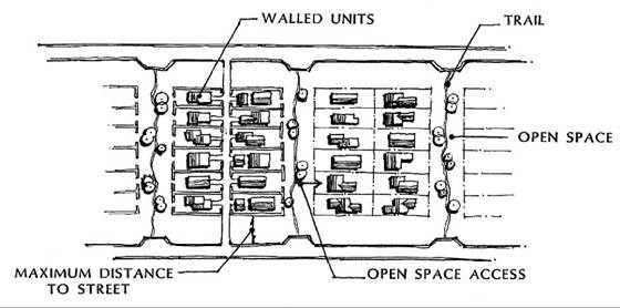 A. Under certain circumstances, atrium, patio, village houses, and town houses of all types do not have to front a street. All such units shall front an open space that meets the standards in Table 08.144. The maximum distance such a unit may be away from a street depends on whether the lot has direct access to both the open space and an alley that provides the lots with on-site parking and emergency access, or whether access is solely via the open space. The distance in Table 08.144 is doubled if a road or emergency access alley is available at both ends of the open space. Figure 08.144 illustrates the various conditions.