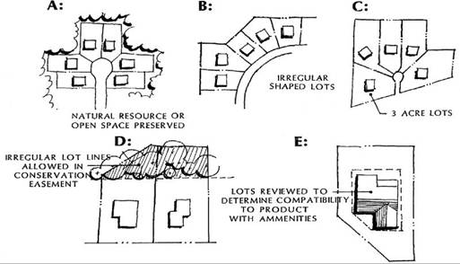 Normally, lot shapes are rectangular or pie-shaped. This pattern works well in some cases; rectangular lots are important when lots are rather small since they provide a maximum buildable area. Pie-shaped lots can be very inefficient. The most important element is that the lot contains a building construction envelope adequate for conventional house design. Lot shapes may be irregular under the following circumstances (see Figure 08.150):